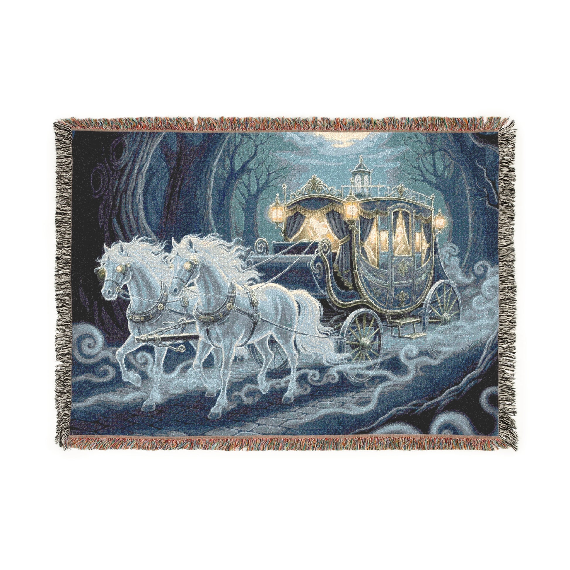 Experience the chill and majesty of a haunted evening with this woven blanket, featuring a ghostly Halloween stagecoach. The detailed design showcases a regal, ornate carriage pulled by a pair of ethereal horses with glowing eyes and flowing manes. The carriage glows with an eerie light, casting a haunting spell as it travels down a cobblestone path. Gnarled, twisted trees and a pale moon complete the chilling scene, adding to the mysterious and spooky atmosphere.