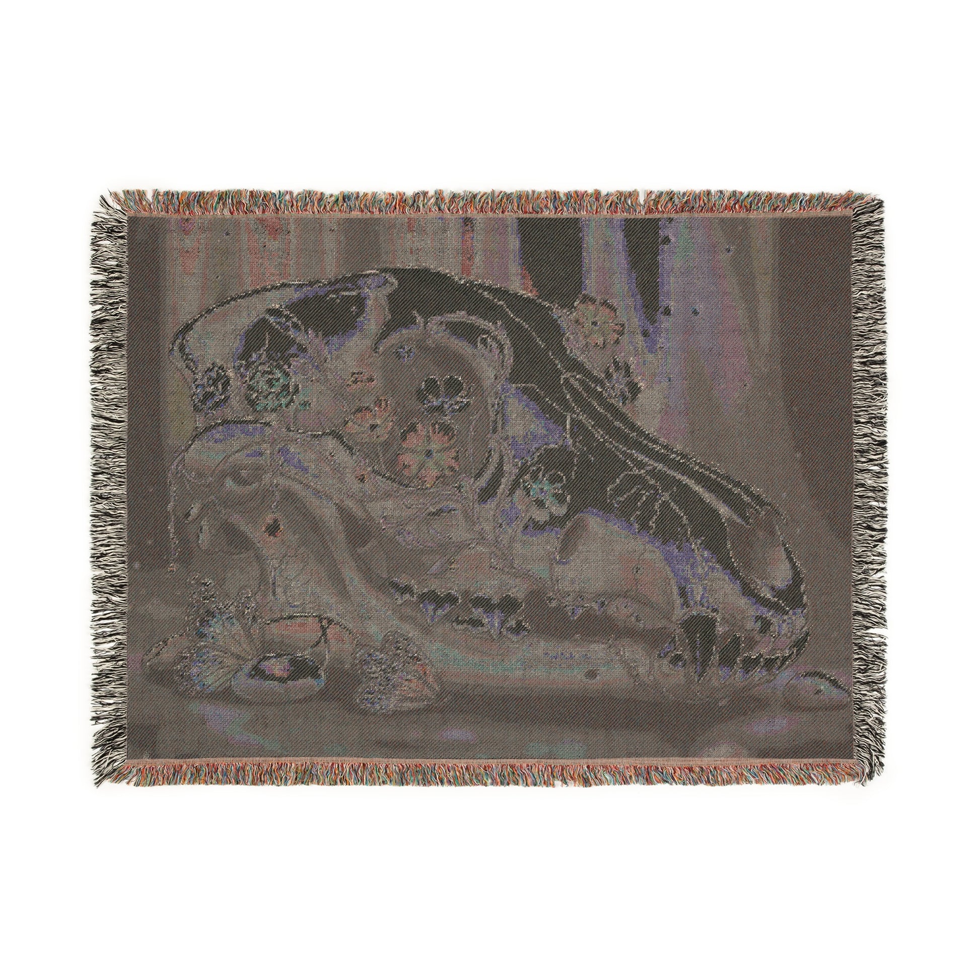 Capture the beautiful and mysterious spirit of the afterlife with this woven blanket, featuring a whimsical skull adorned with enchanting flowers. This intricate design showcases a detailed, pearlescent skull surrounded by ethereal flowers, delicate vines, sparkling crystals and gems.