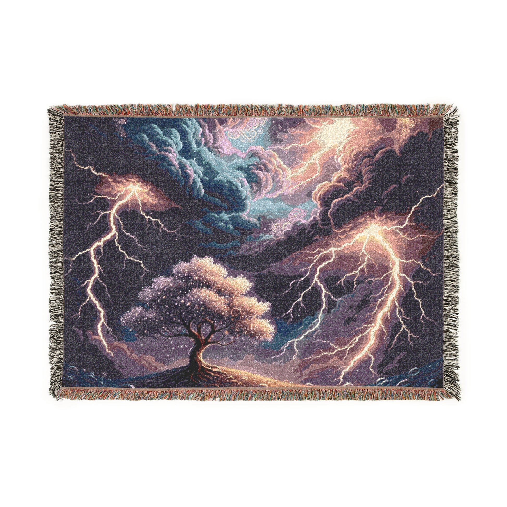 Wrap yourself in a storm of serenity with the "Storm Pink Tree" woven blanket, a cozy masterpiece inspired by the stunning image. This unique blanket captures the ethereal beauty of a vibrant pink tree standing strong against a swirling sky of purple, blue, and pink clouds. Bolts of golden lightning crackle across the scene, illuminating the intricate details of the tree's shimmering blossoms.